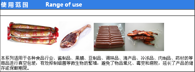該機(jī)適 用如:肉類加工、醬腌產(chǎn)品、水產(chǎn)、海產(chǎn)品加工、蔬菜加工、農(nóng)副產(chǎn)品加工、果脯、糧食、豆制品、藥材、電器、化學(xué)制品等顆粒、粉狀、液體等食品進(jìn)行真空后充惰性氣體包裝、可以防止產(chǎn)品氧化霉變、腐敗、防潮達(dá)到延長產(chǎn)品的儲存期限。